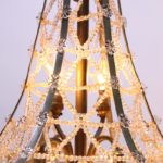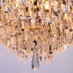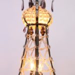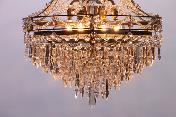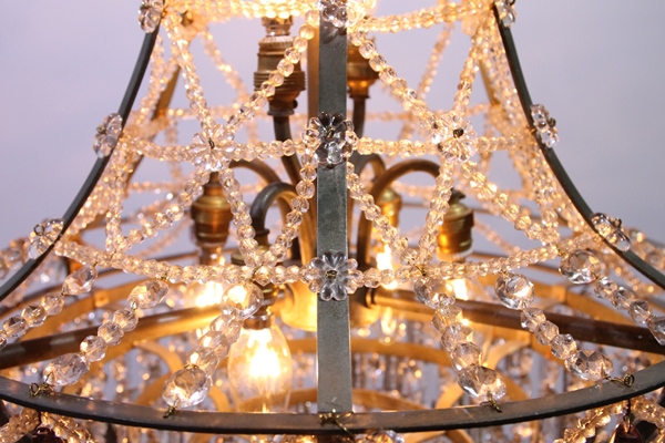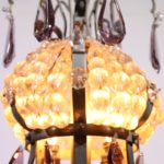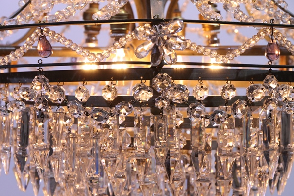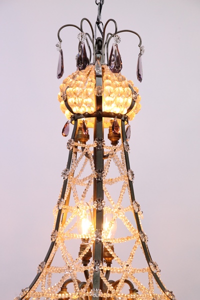 Unieke grote nikkelkleurige zakkroonluchter met 8 lichtpunten 4 onder in de kroonluchter, 2 in het midden en 2 boven in een kroon van vele kleine kraaltjes, de kroonluchter heeft aan de onder kant 5 ringen vol met ijspegels het middelste gedeelte is prachtig versierd met kettingen van hele kleine kraaltjes verder hangen er enkele paars gekleurde kristallen in de kroonluchter.