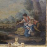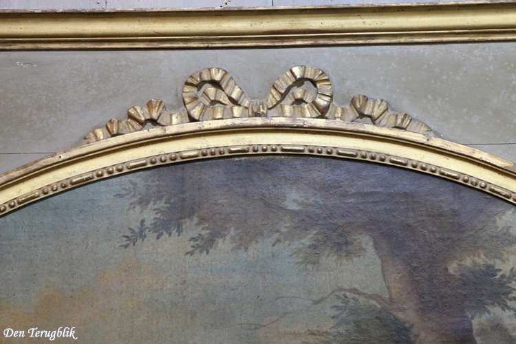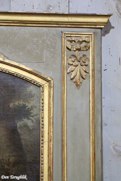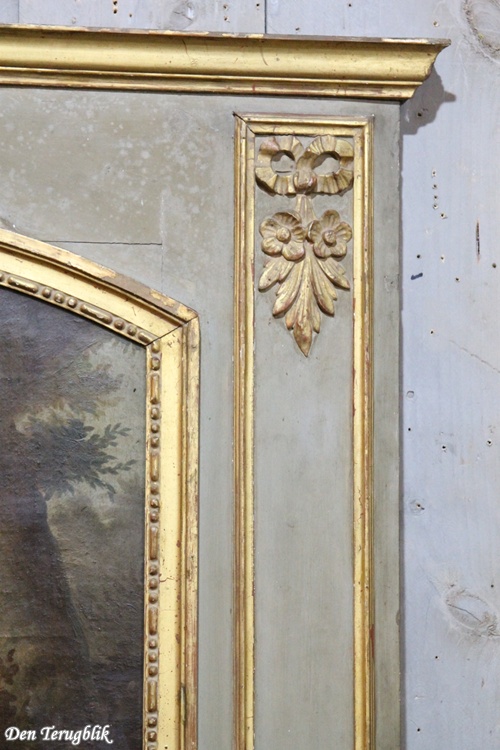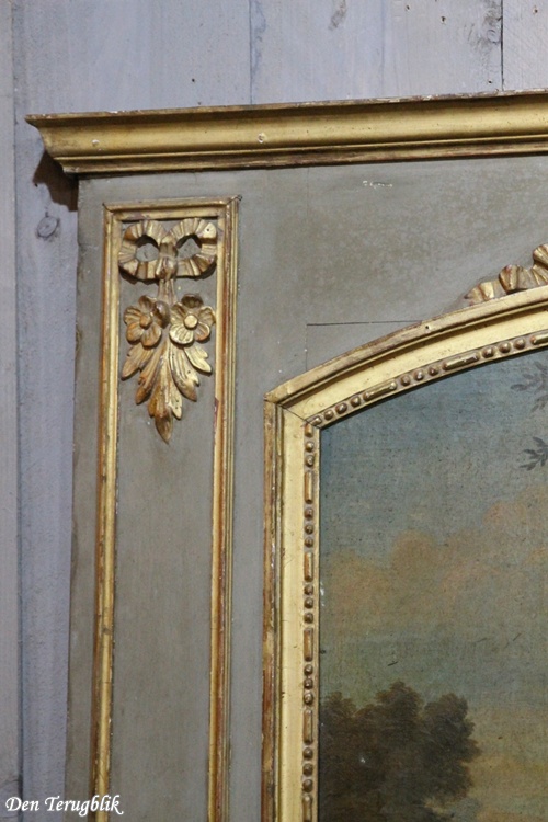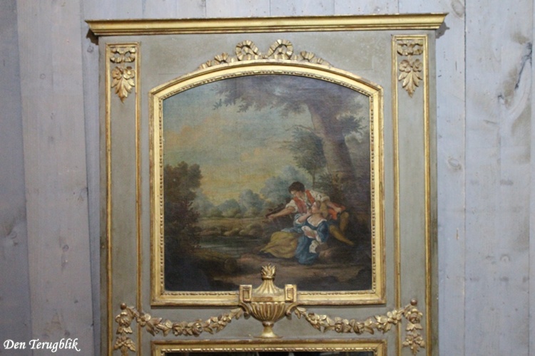 Het mooie romantisch paneel geschilderd op doek zit in een vergulde lijst zo ook de spiegel aan de onderkant.