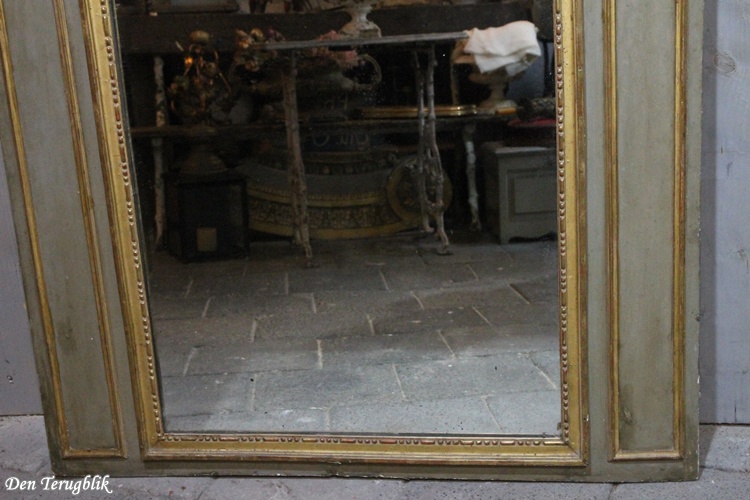 De spiegel heeft een geweldige mooie groen / grijs patina met goud kleur elementen versierd.