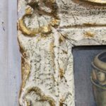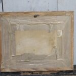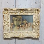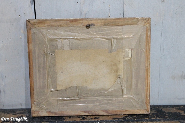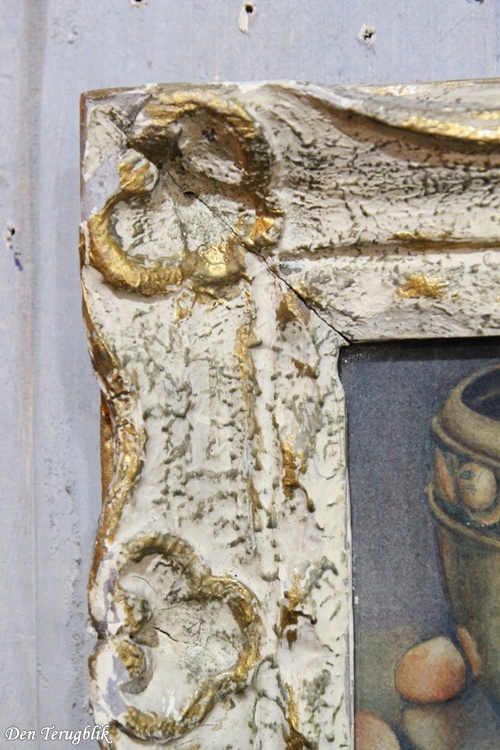 Het paneeltje is van karton en zit in een mooie sierlijk gebroken wit met wat goud kadertjes.