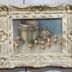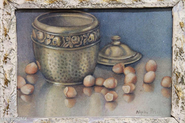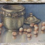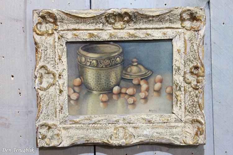 Leuk klein oud stilleven paneeltje koper potje met hazelnootjes.