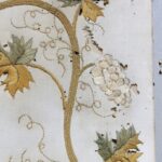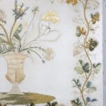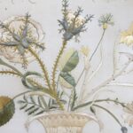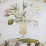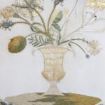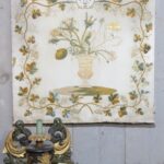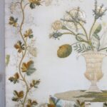 19Eeuws paneel van een zijde stof met prachtig hand geborduurd decoratie van bloemen in een vaas en een mooie sierrand.