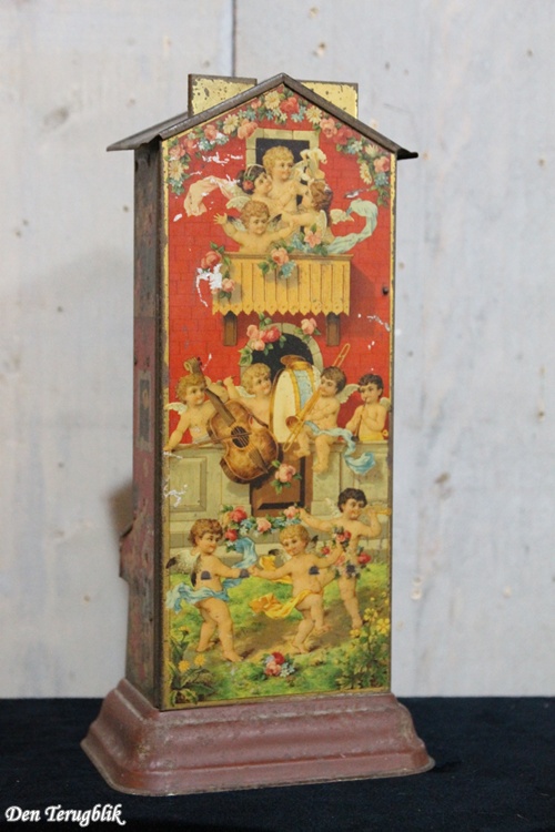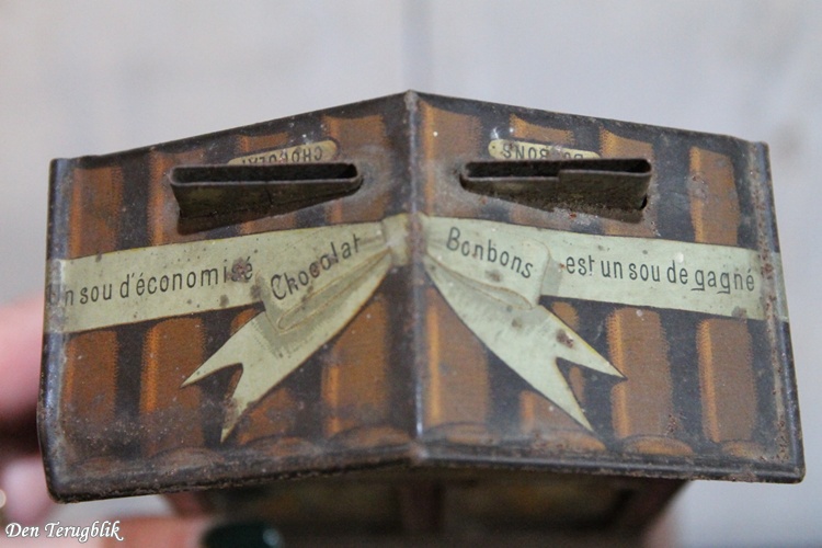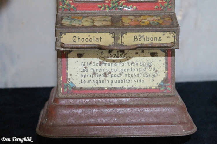 Mooi antieke tinnen chocolade /bonbon spaarpot