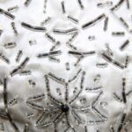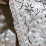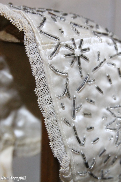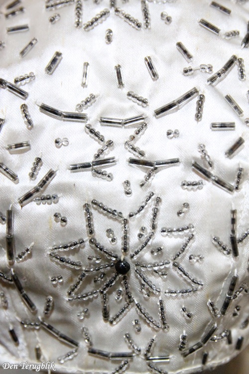 Het stof is heel licht creme kleur gedecoreerd met klein kraaltjes.