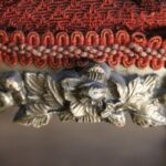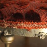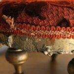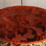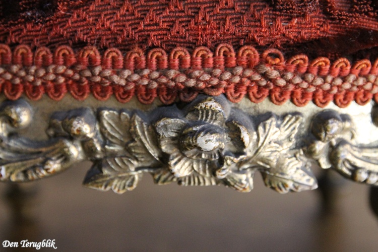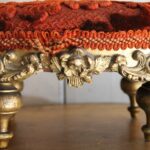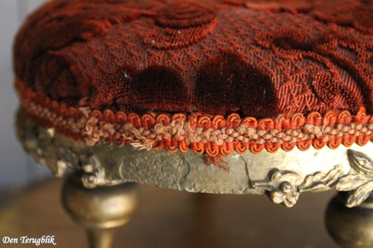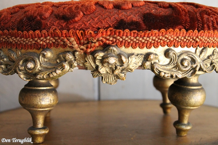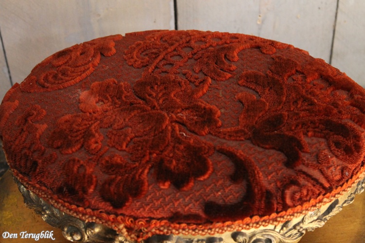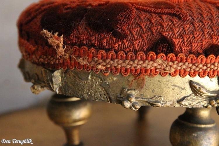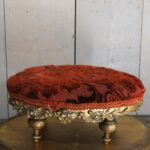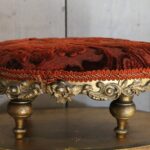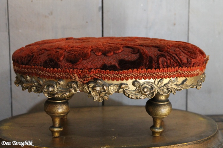Antiek Frans voetenbankje met een bordeaux rood reliëfpatroon velours stofje.