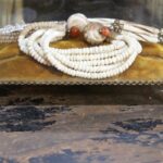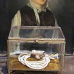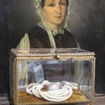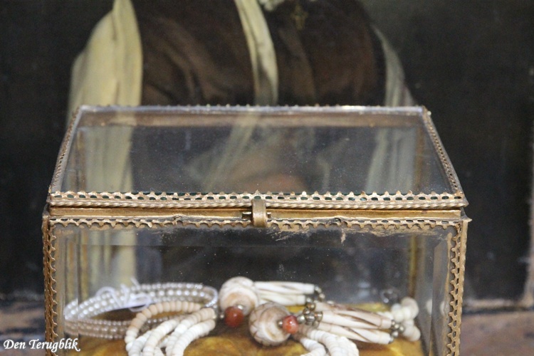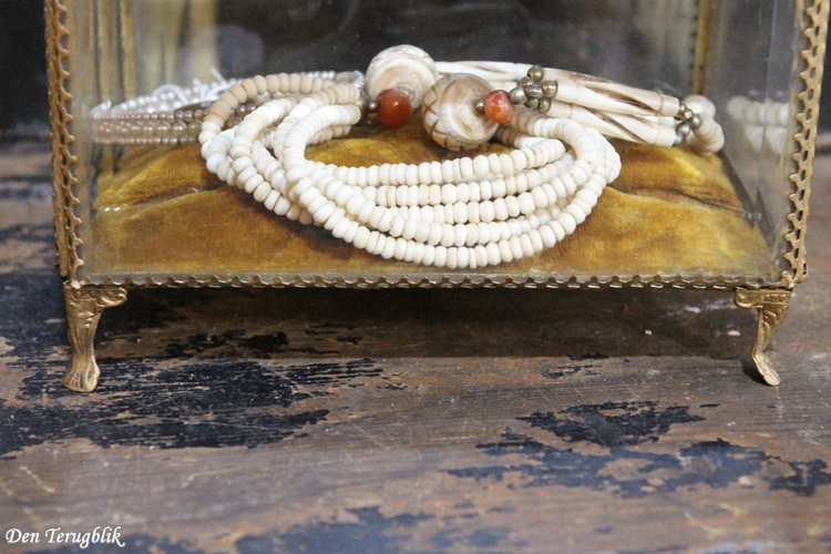 Binnen in op de onderkant ligt een mooie gecapitonneerd oker kleur fluweel stofje in een mooie staat.