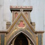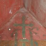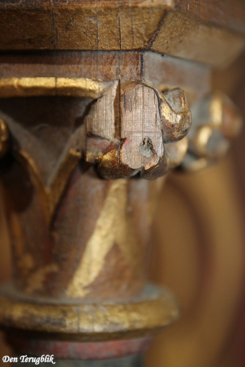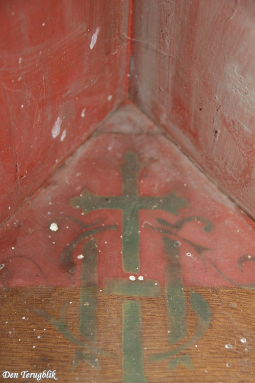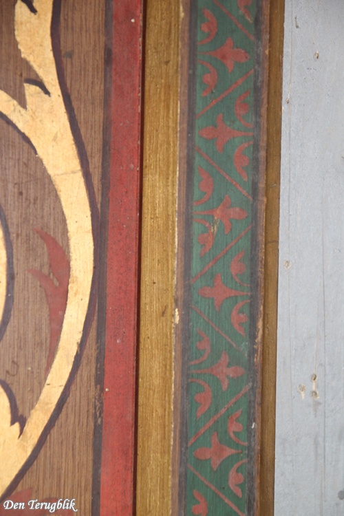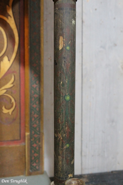 The front is flanked by columns with capitals, which also have painted decorations. (One capital is missing a piece.)
