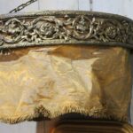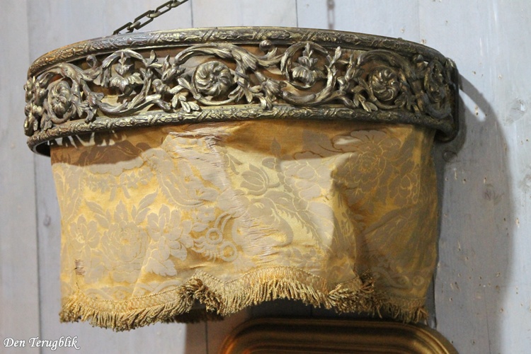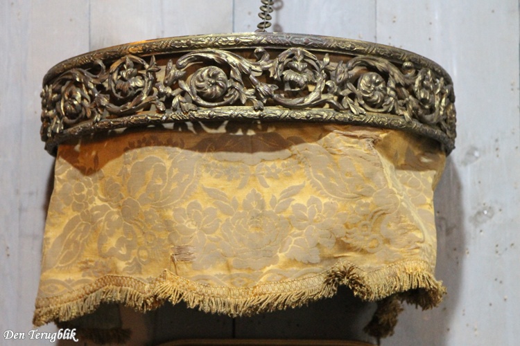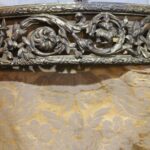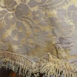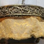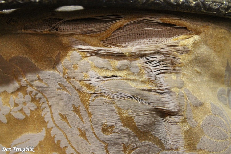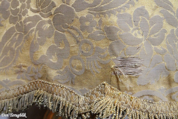 It contains the original fabric, which is gold-colored with a floral motif and a fringed edge (which has three worn spots).