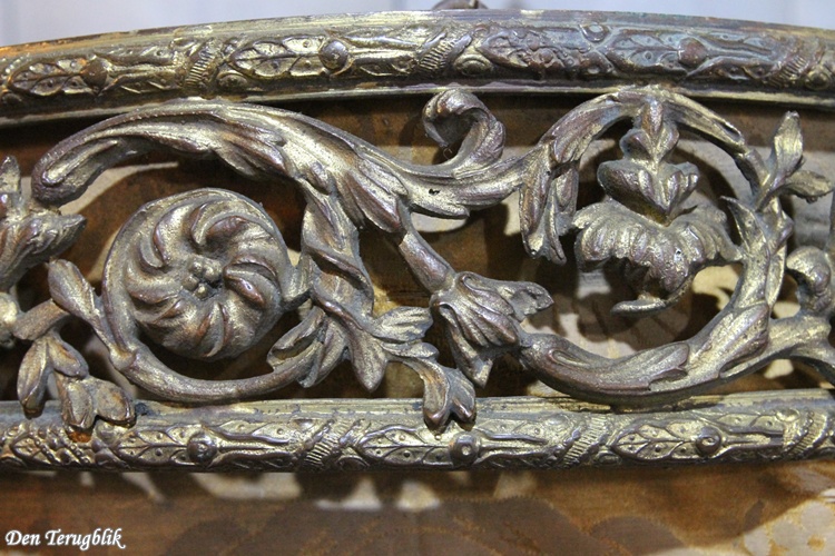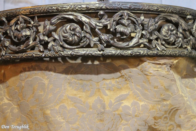 The ciel de lit has a richly decorated gold-plated brass rim with a dark patina.