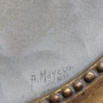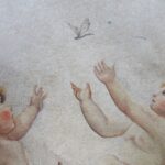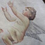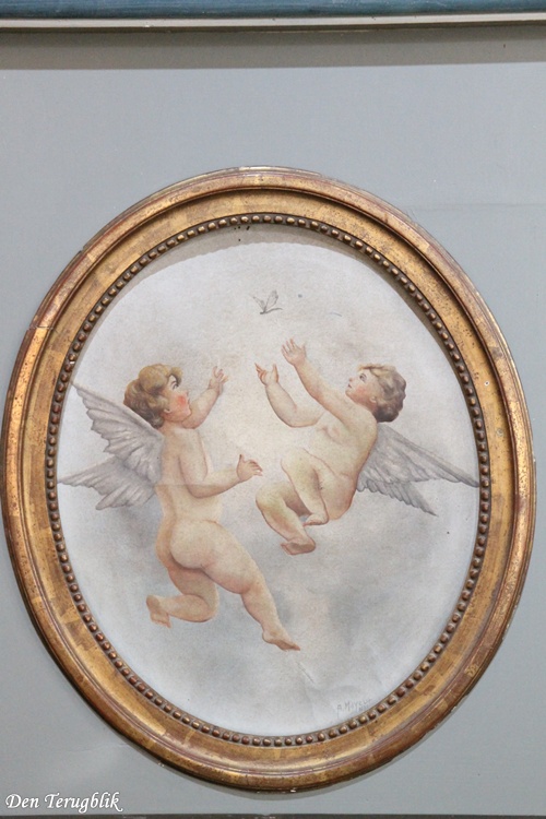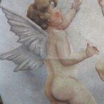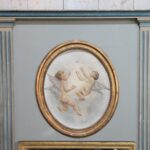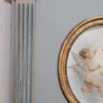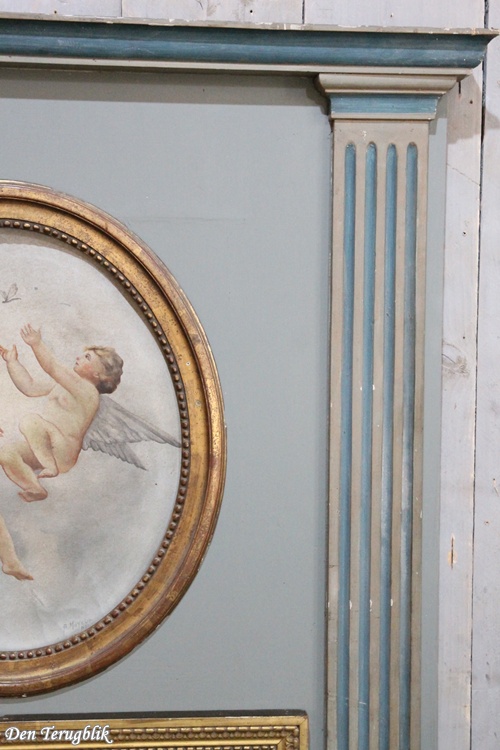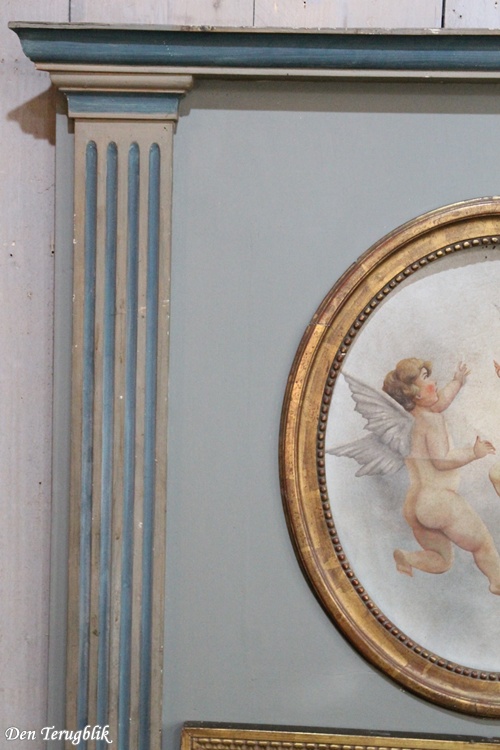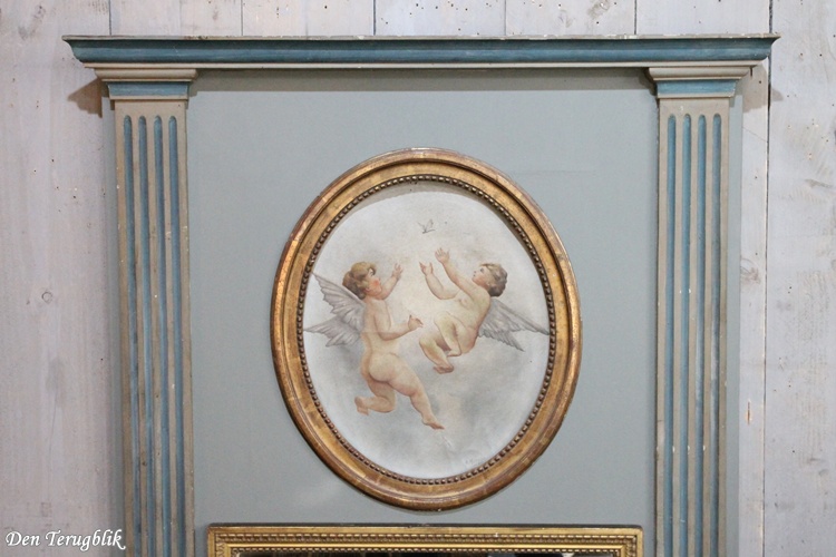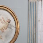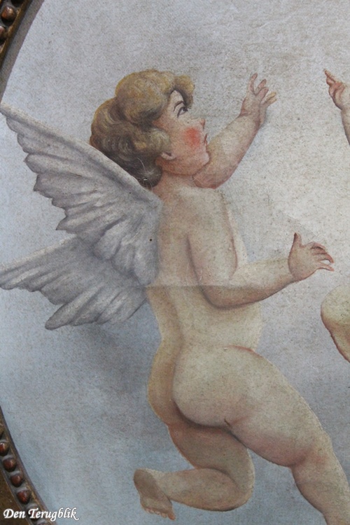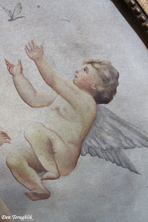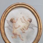 At the top is an oval, gold-plated wood frame containing a hand-drawn panel with putti.