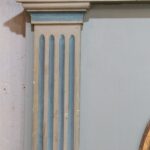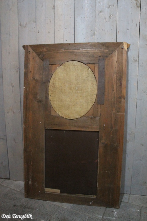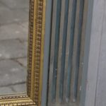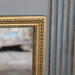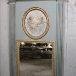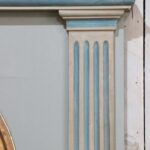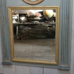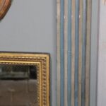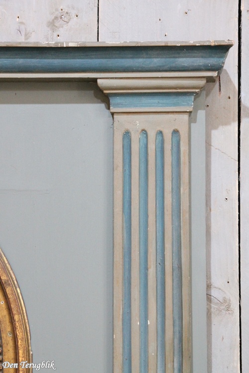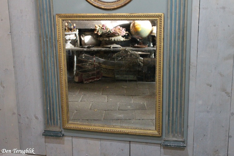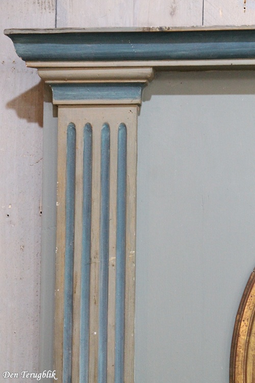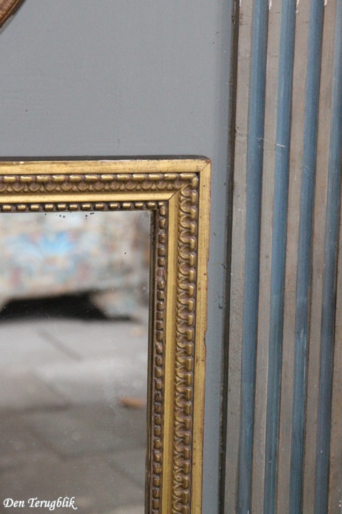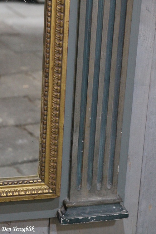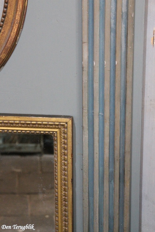 The mirror has a wooden frame with pilasters along the sides, accented with blue.