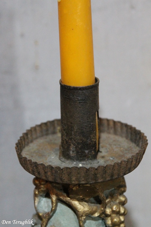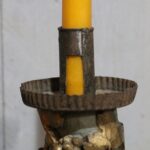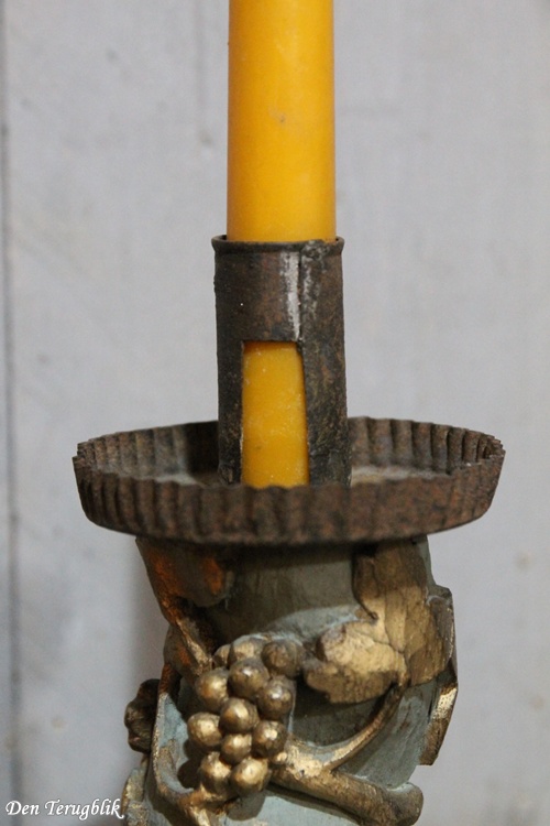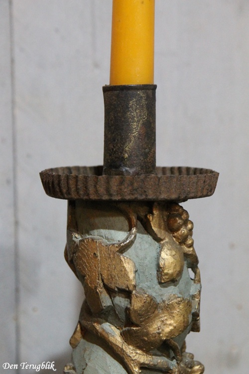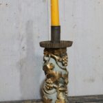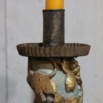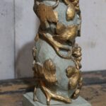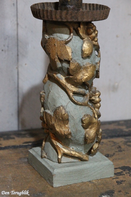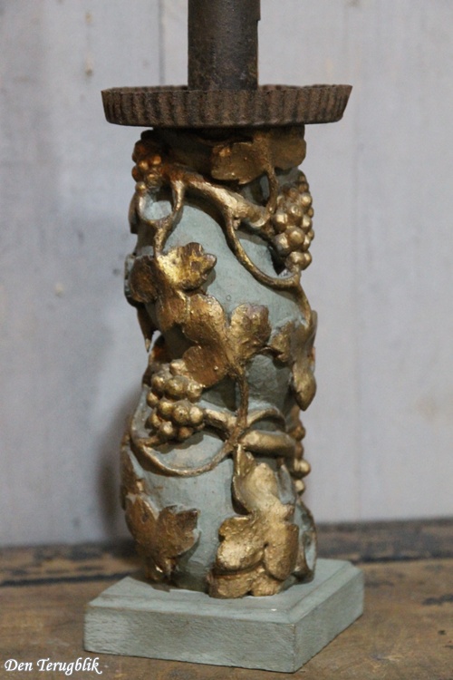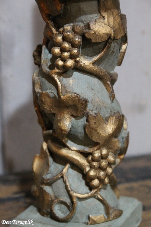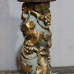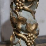 It has a gray base with a golden bois garland of leaves and grape clusters around it.