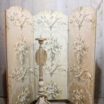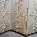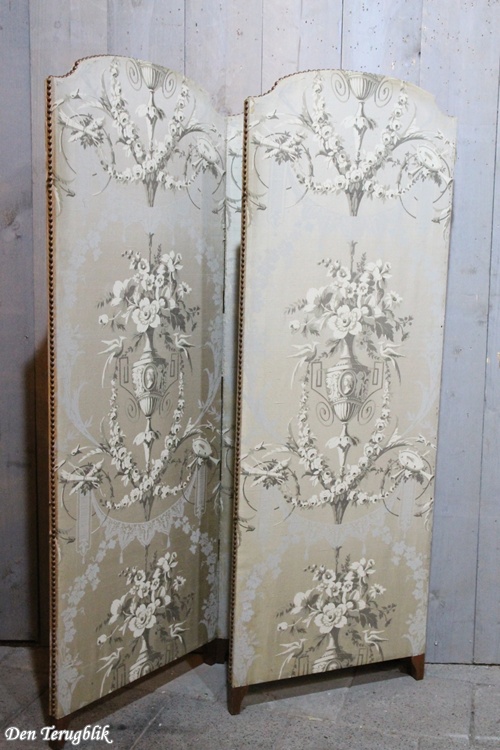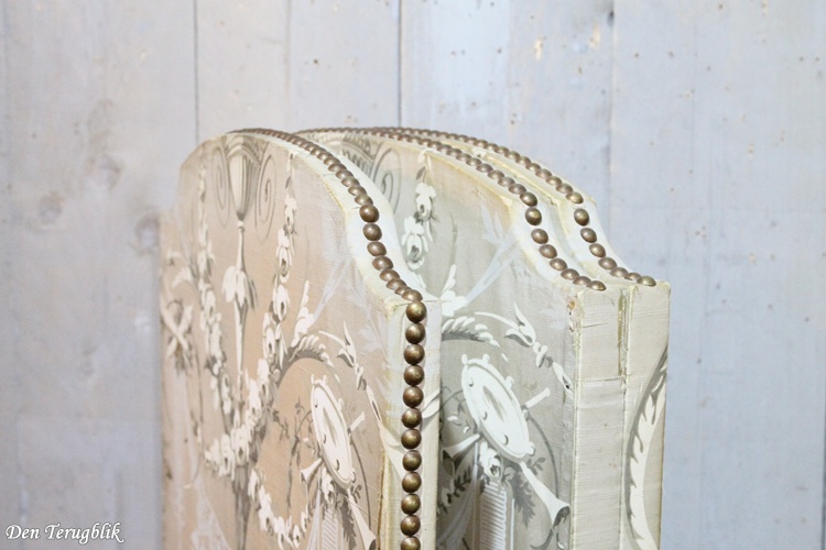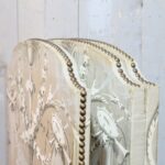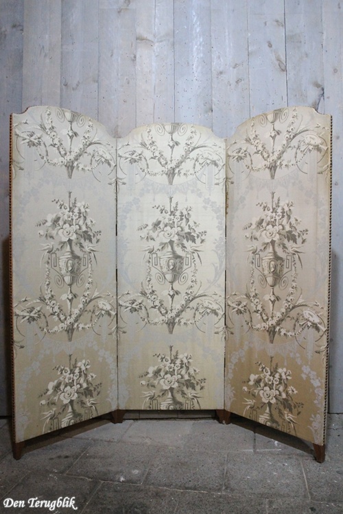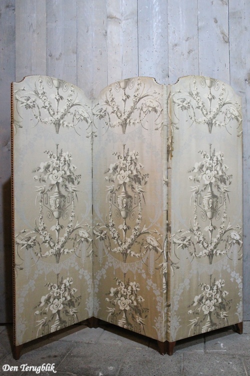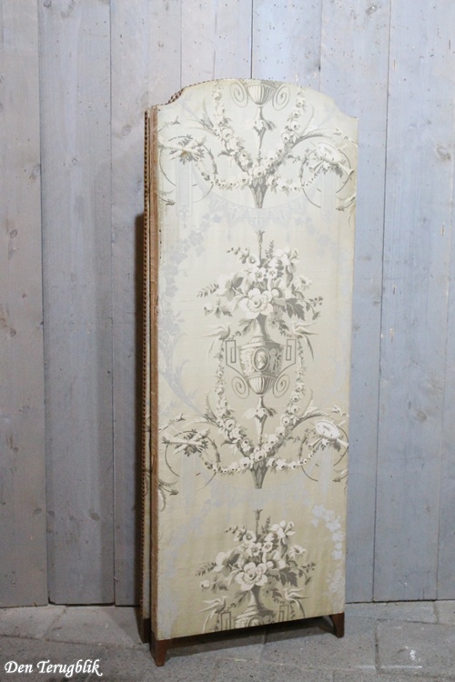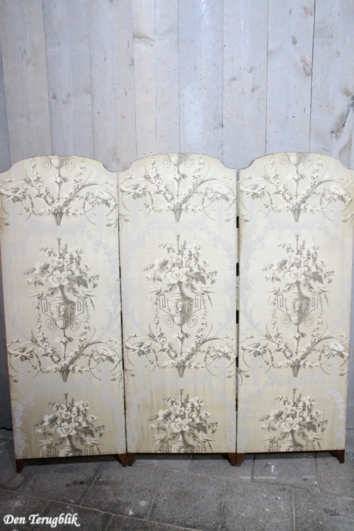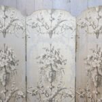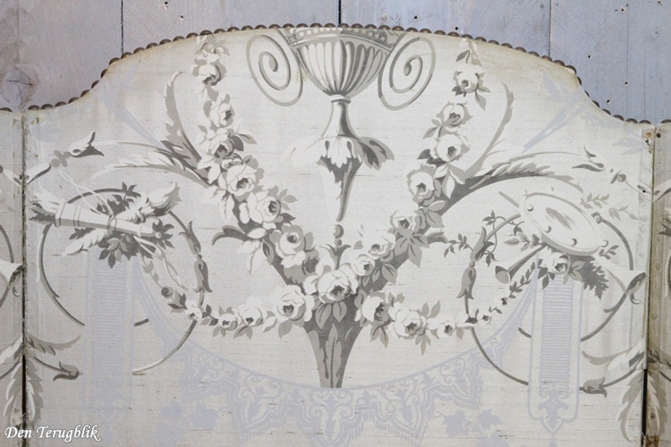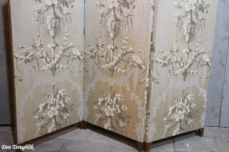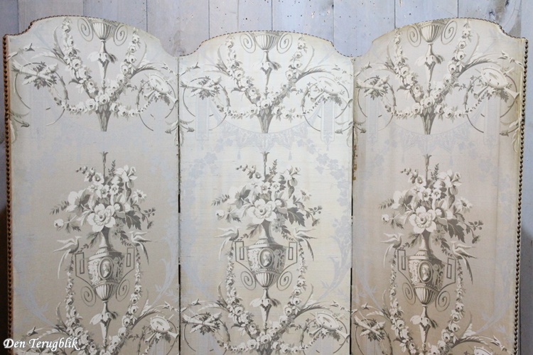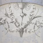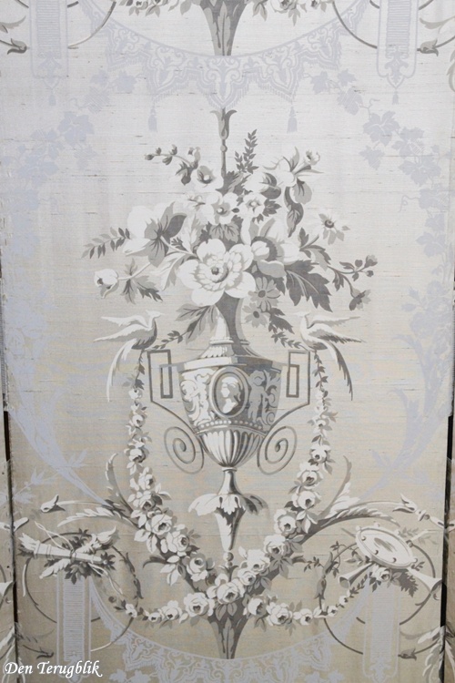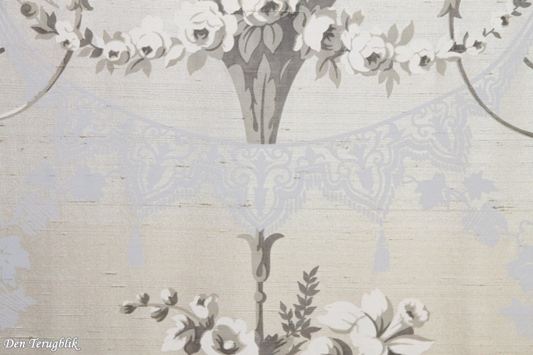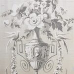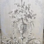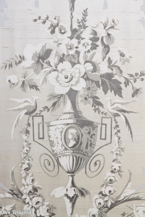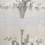 The fabric features a lovely decoration of flowers in a vase, garlands, and birds.