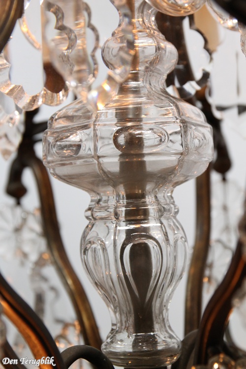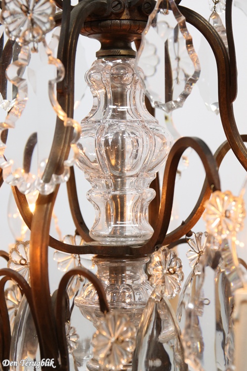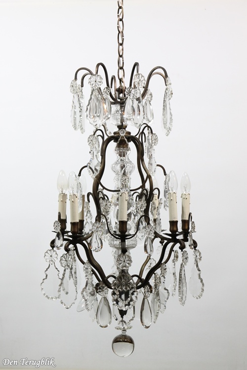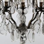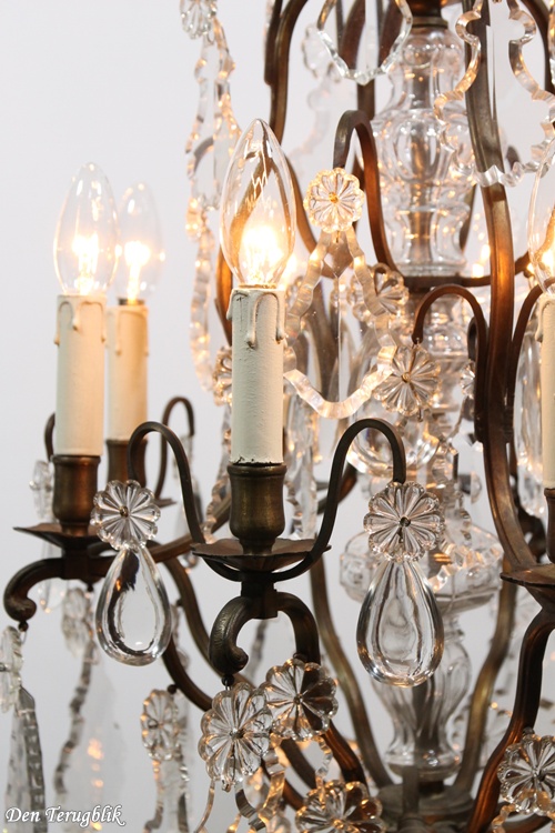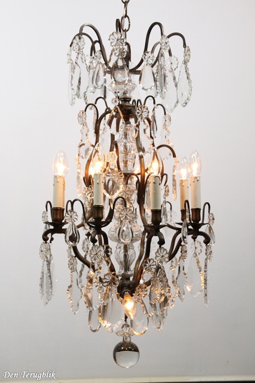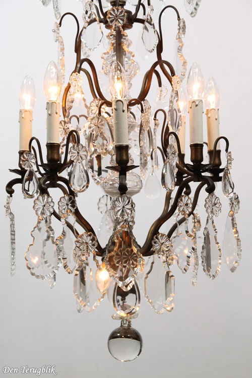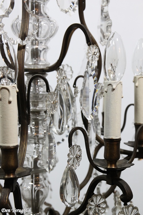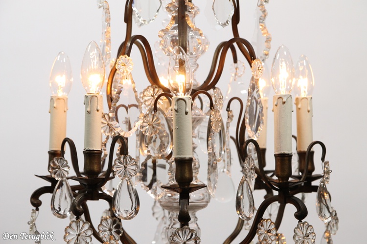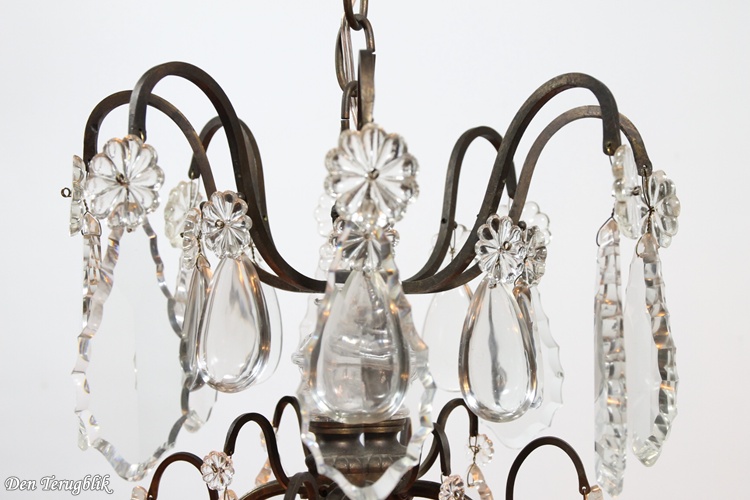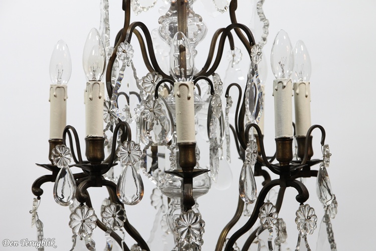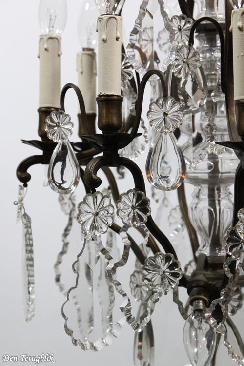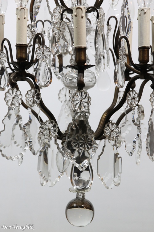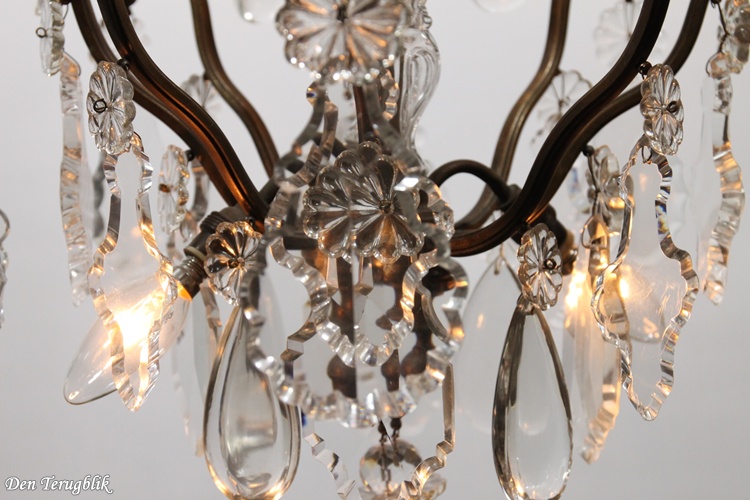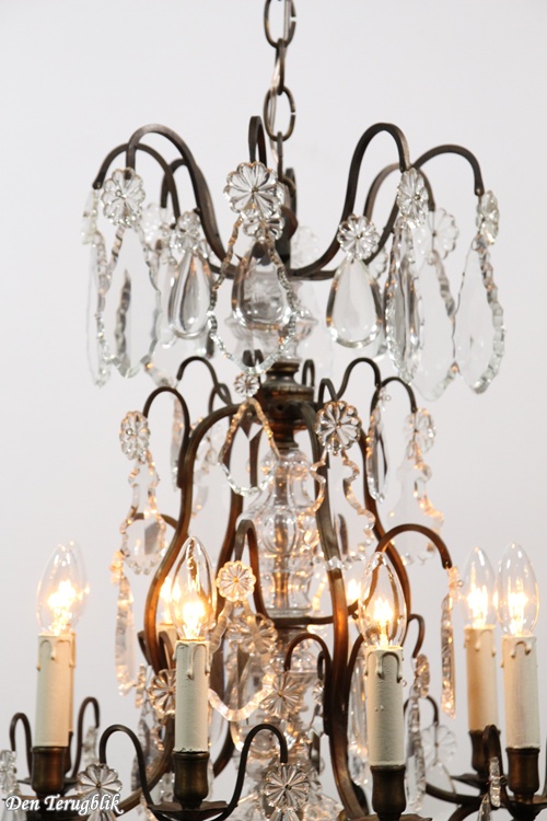The frame has a beautiful dark patina and is decorated with some big leaf-cut crystals.