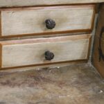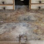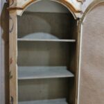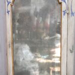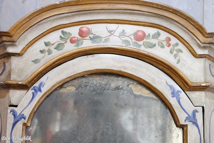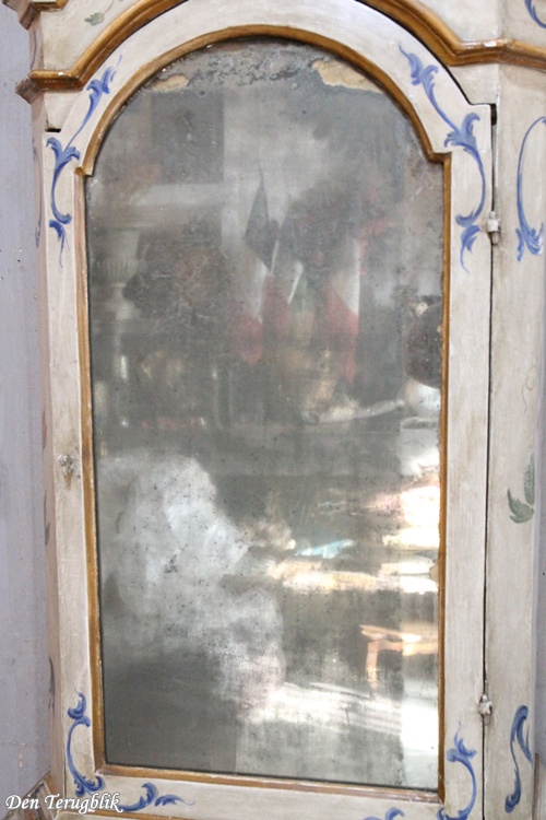 The display case contains the original weathered mirror and shelves inside.