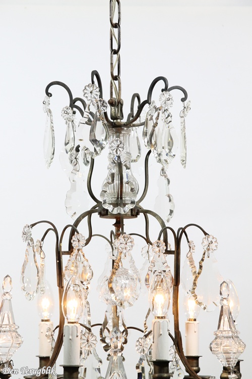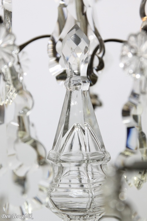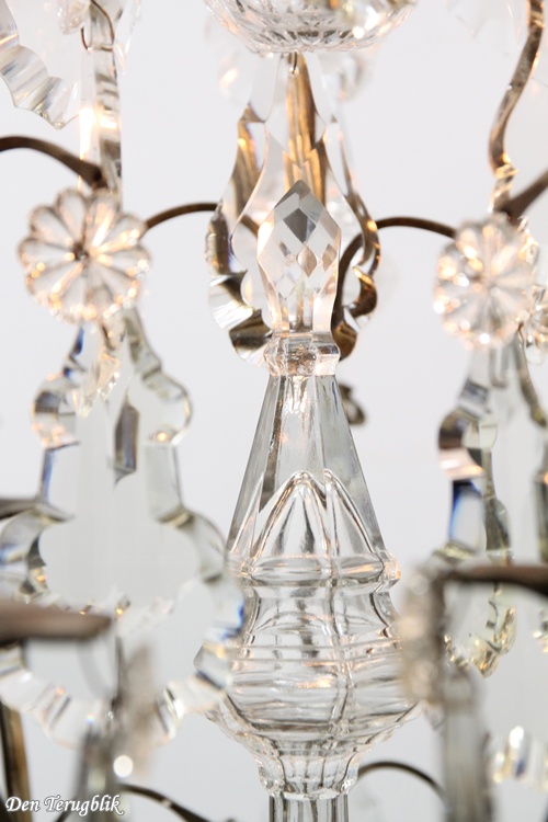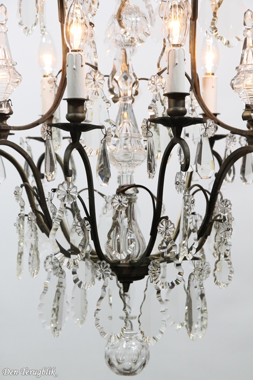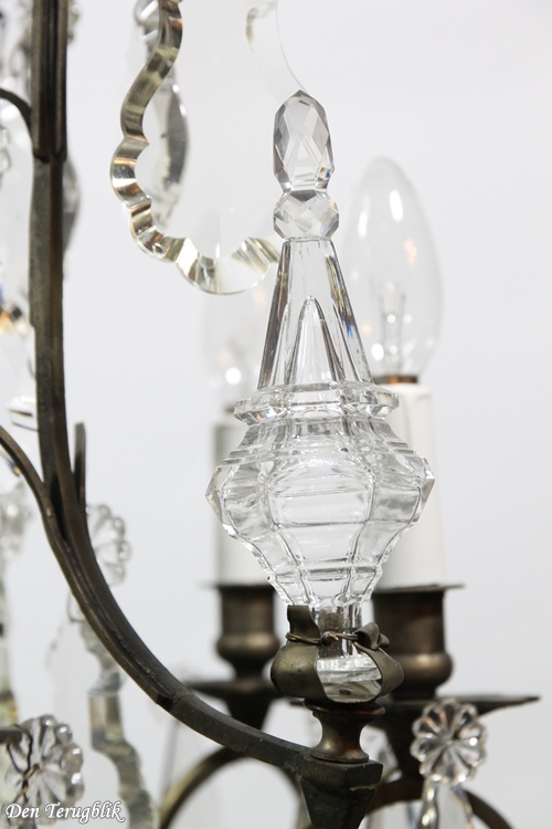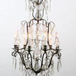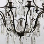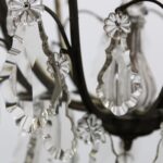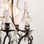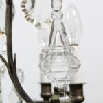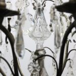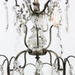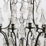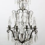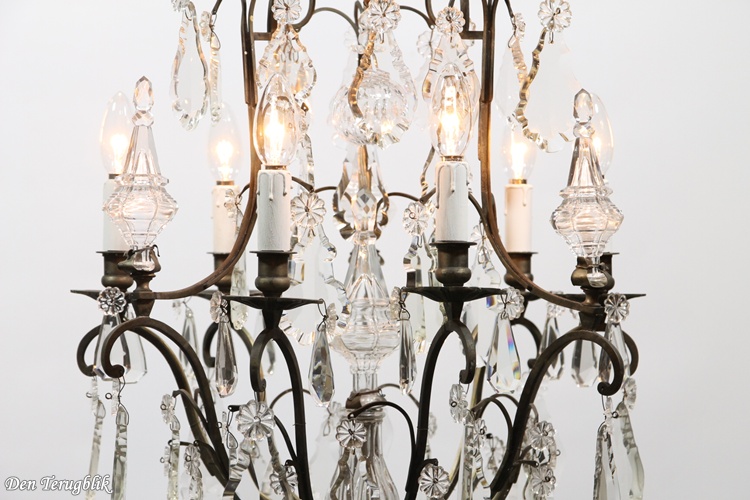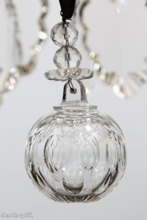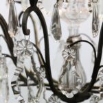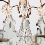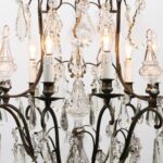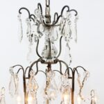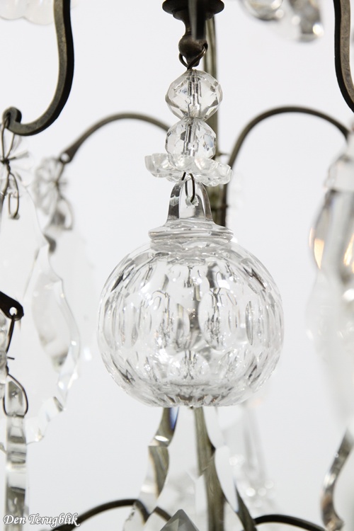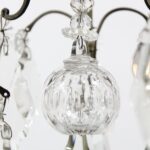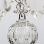 Furthermore, the chandelier is hung with clear crystals, and a faceted sphere hangs in the center at the top and bottom of the chandelier.