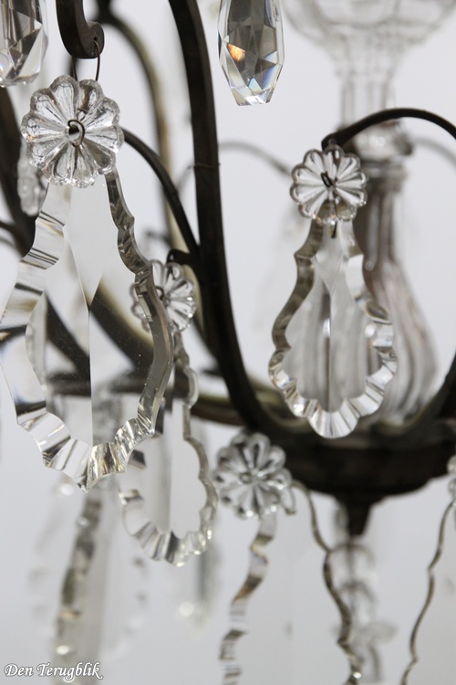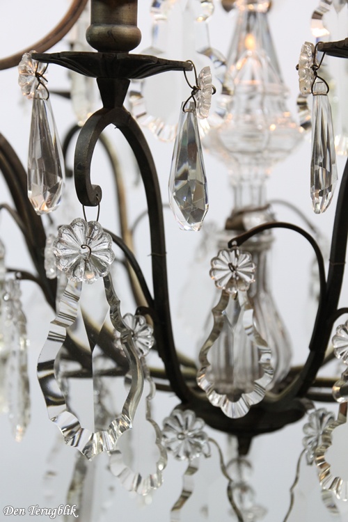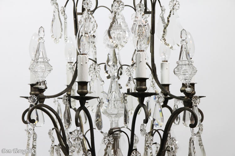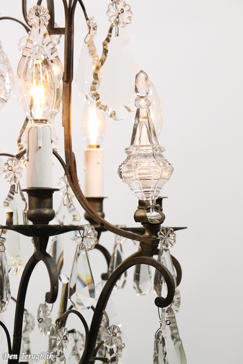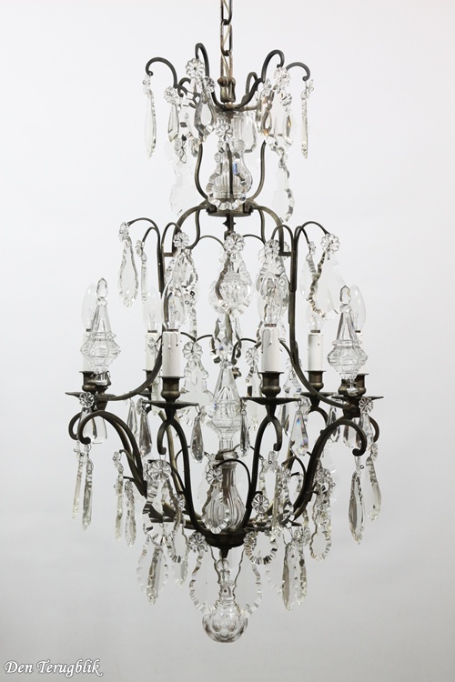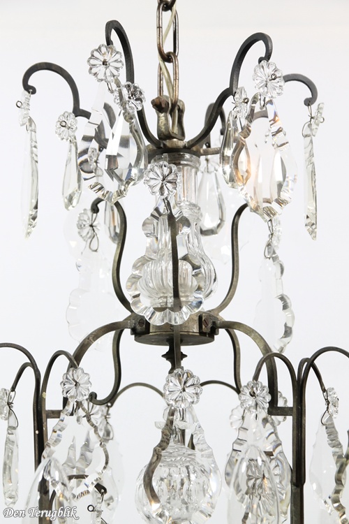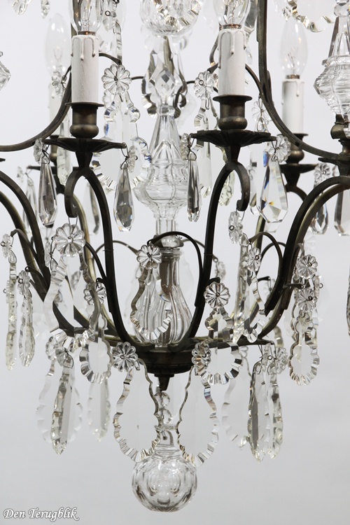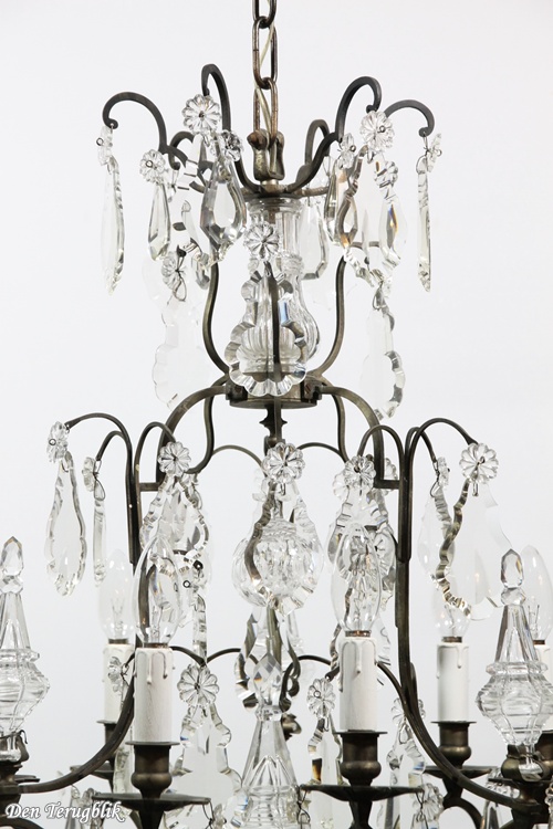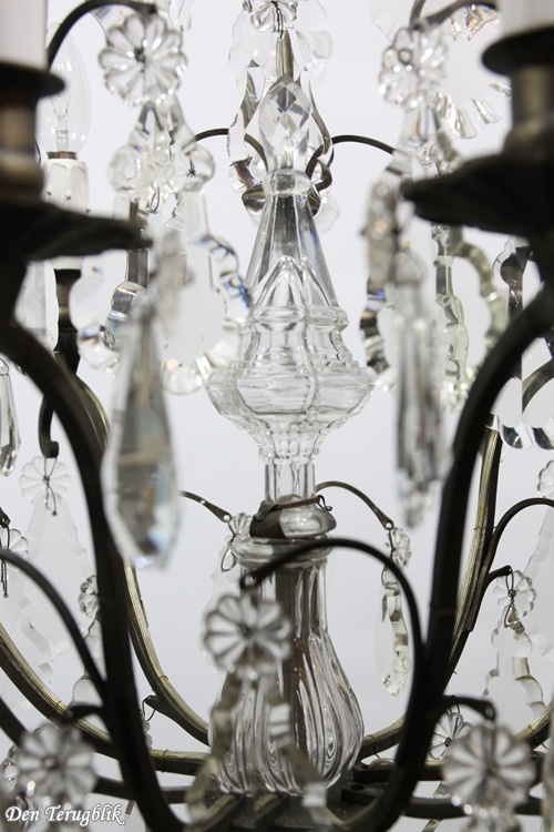 Furthermore, the chandelier is hung with clear crystals, and a faceted sphere hangs in the center at the top and bottom of the chandelier.