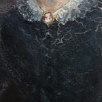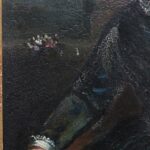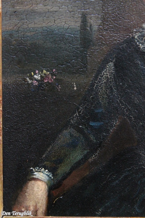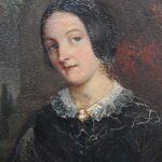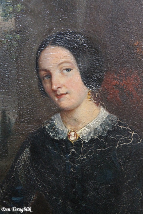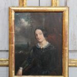 Small antique panel depicting a lady in a black dress.