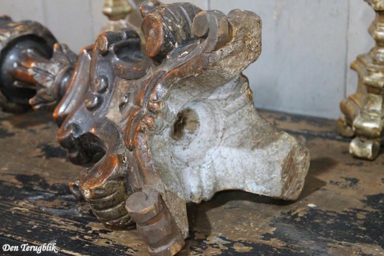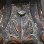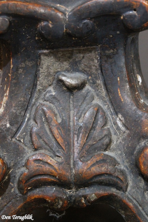 It features richly decorated hand-carved wavy shapes and a triangular base with scrolled feet.